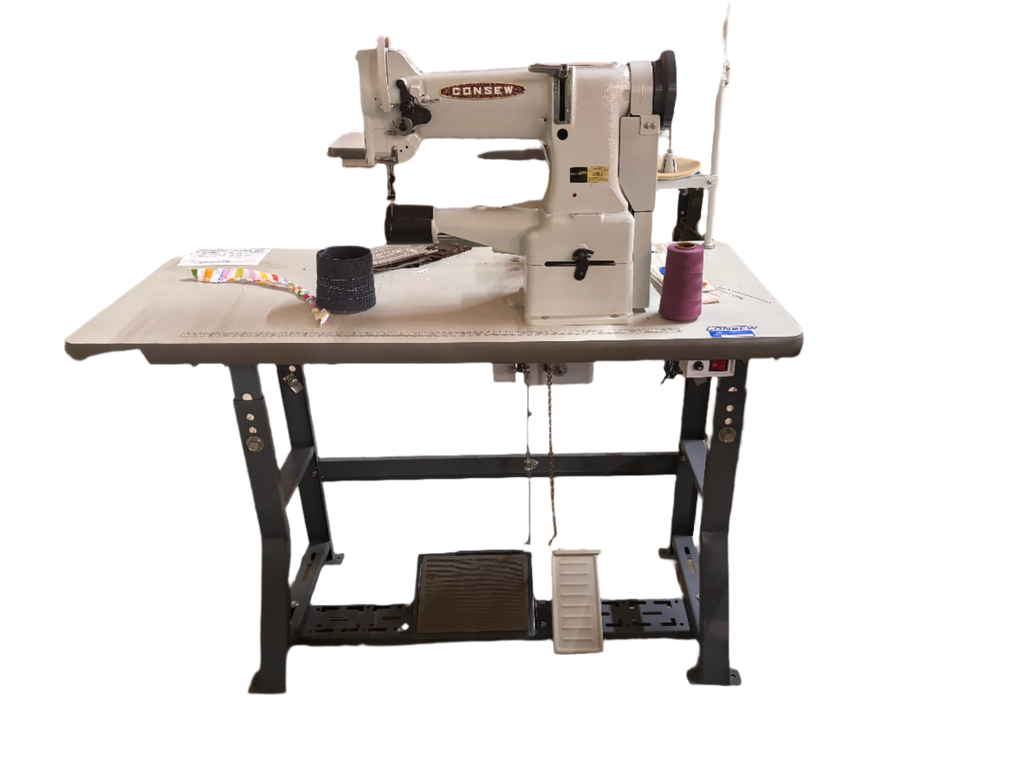 The Consew 227R-2 is a high-performance industrial sewing machine built for handling thick and difficult materials. It features a 10-inch cylinder bed and is equipped with both a walking foot and needle feed system to ensure consistent feeding through multiple fabric layers. With a top speed of 3,000 stitches per minute, it also includes a vertical-axis rotary hook and a safety clutch designed to protect the machine from damage.
